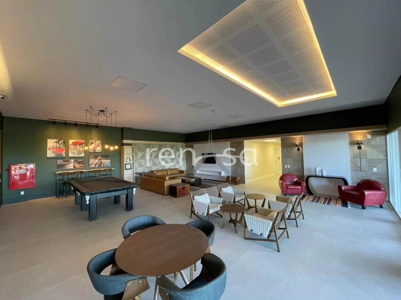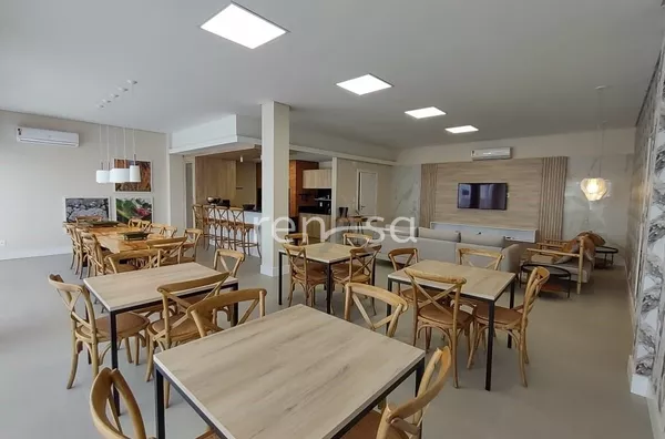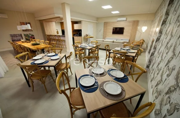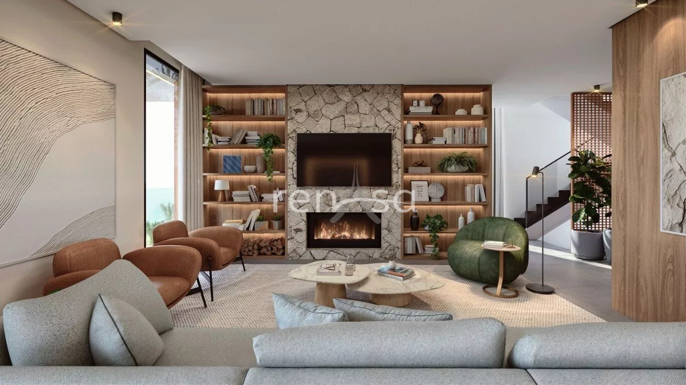 O pavimento térreo abriga uma área social convidativa, onde a sala de estar, equipada com uma aconchegante lareira, se une à sala de jantar, à cozinha e à varanda de maneira fluida. Esse ambiente amplo e iluminado é ideal para momentos de descontração e celebração em família.