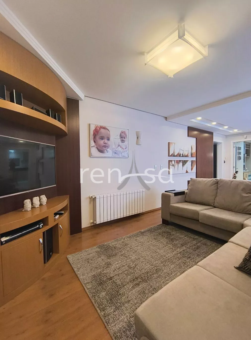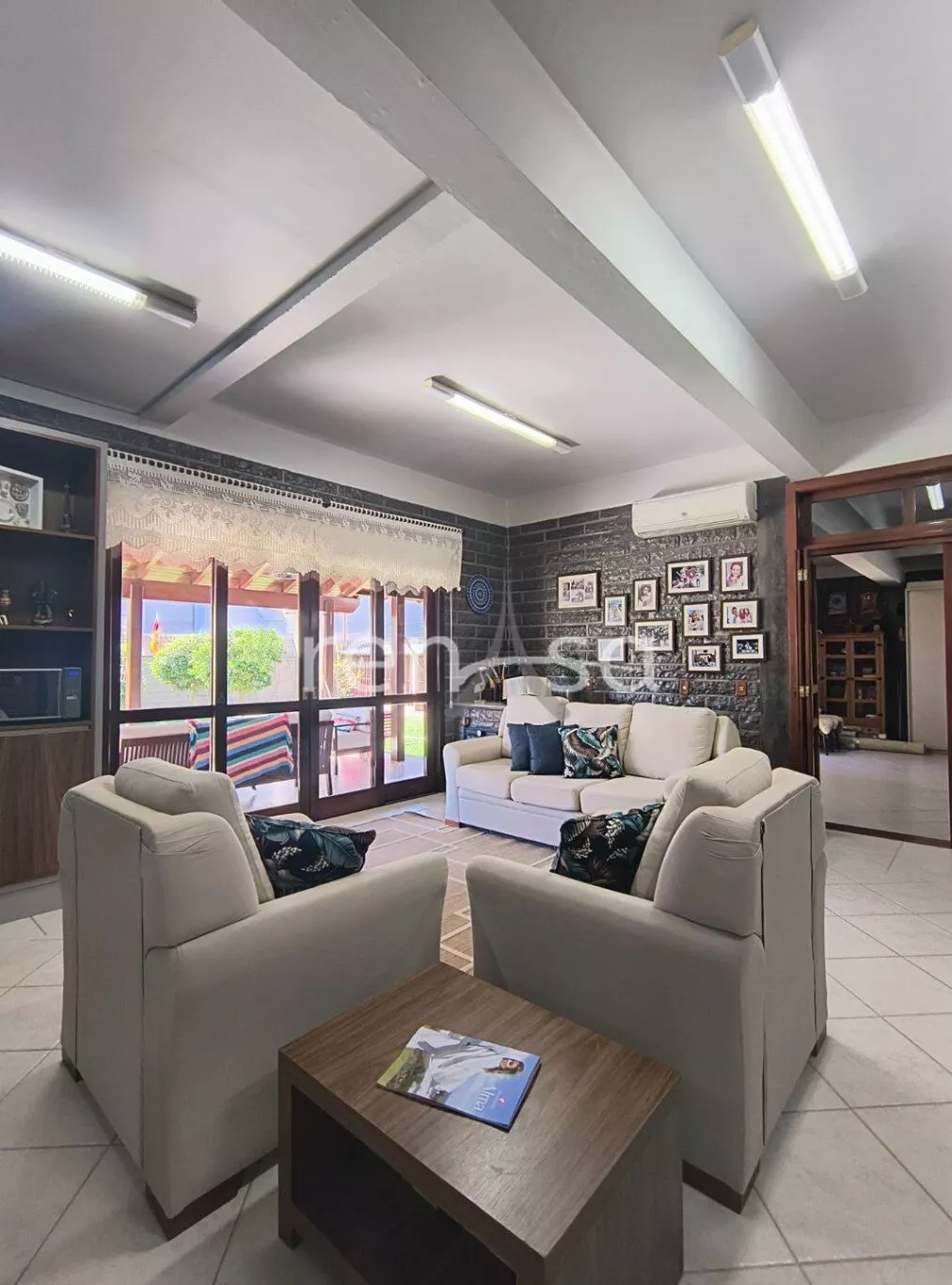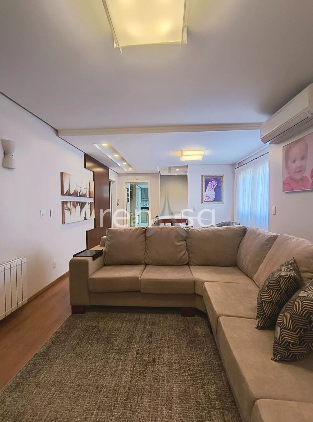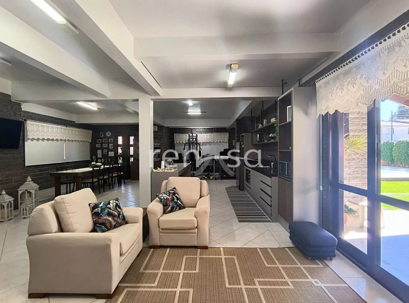 Sala de estar e jantar integradas com lareira e acesso à sacada;